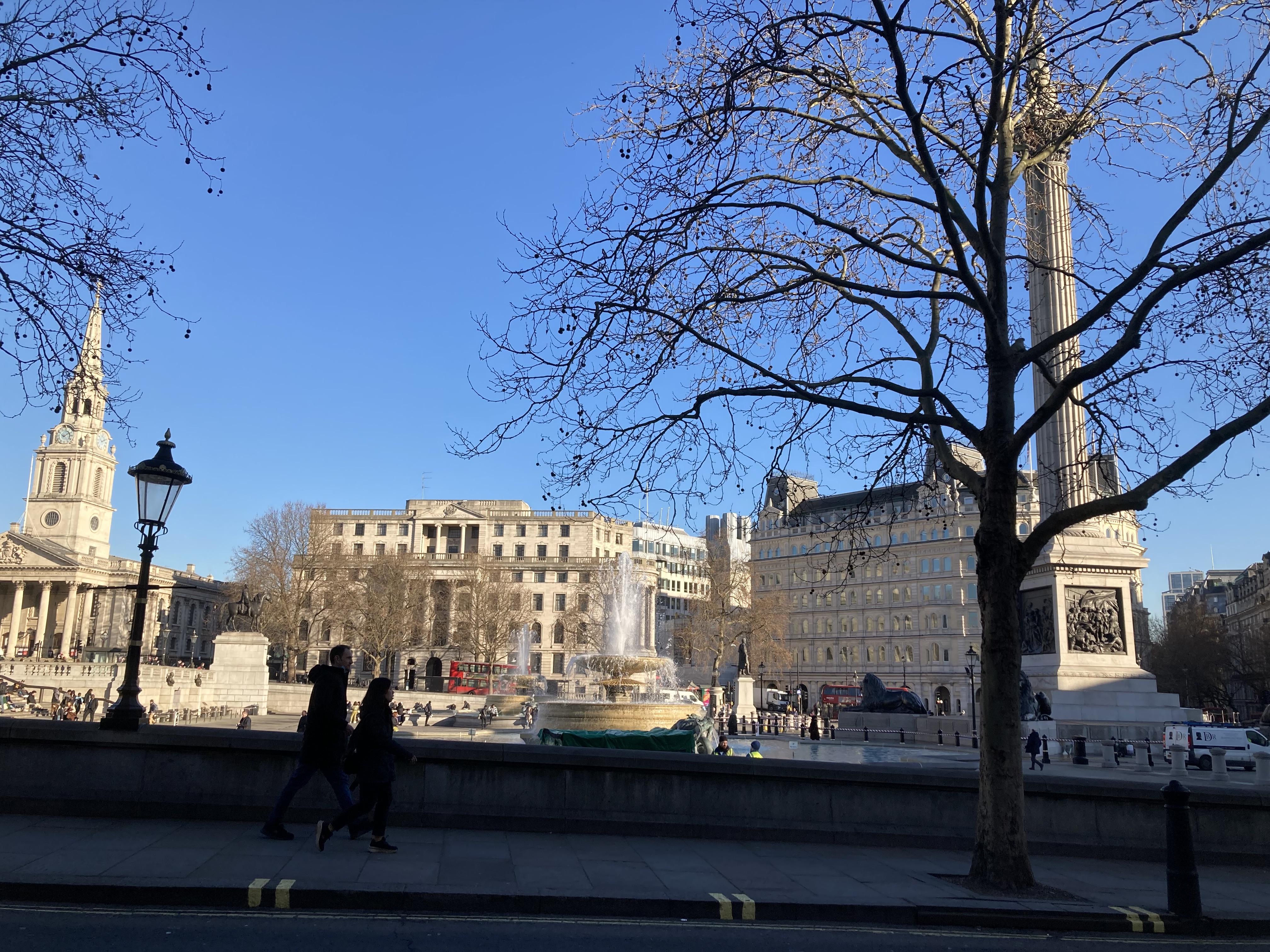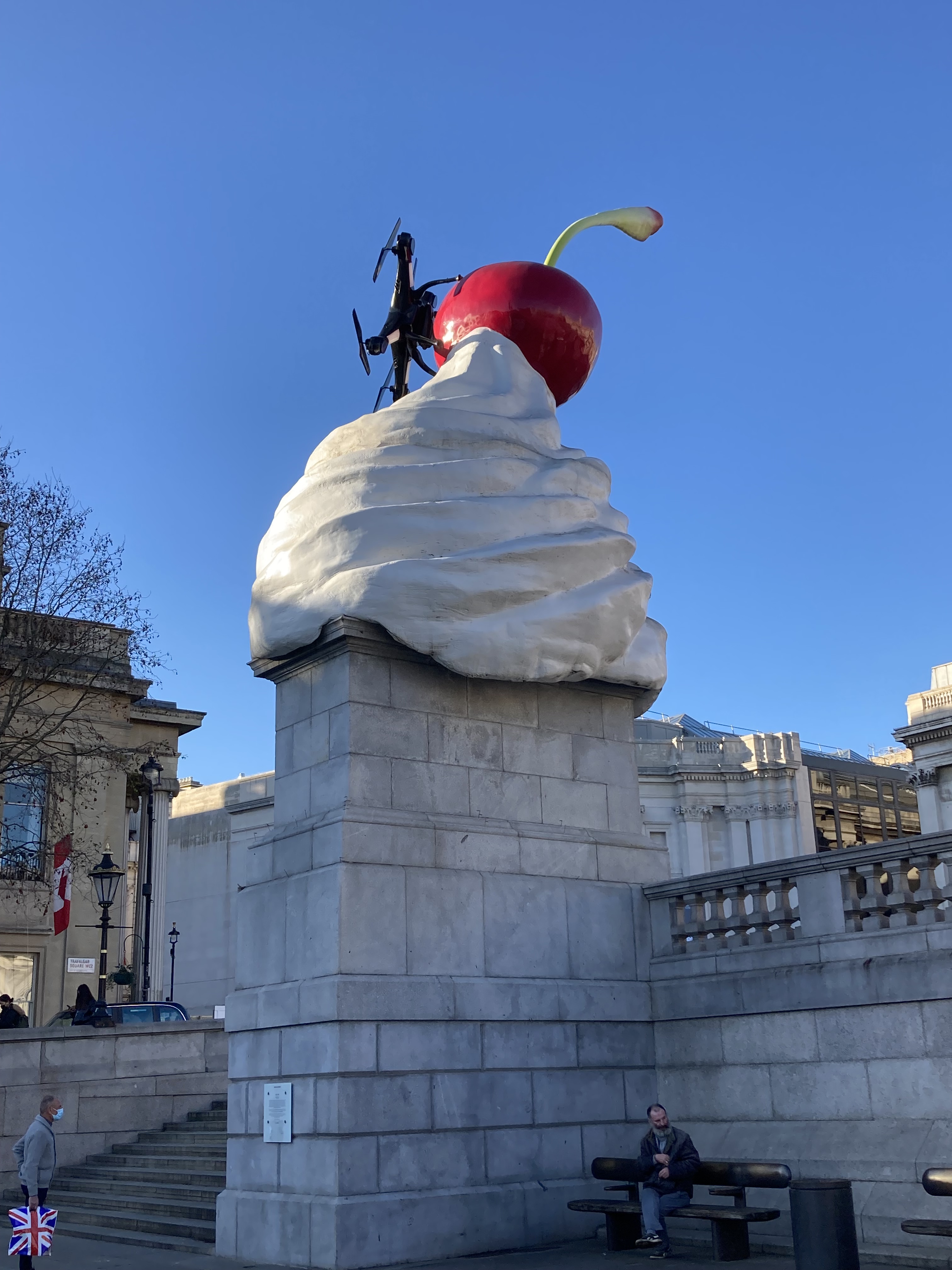 Final stop of the day was at Trafalgar Square to see what was on the Fourth Plinth. At the moment it’s a sculpture called The End by Heather Phillipson. It’s a giant swirl of whipped cream, a cherry, a fly and a drone which suggests both exuberance and unease, responding to Trafalgar Square as a site of celebration and protest.
