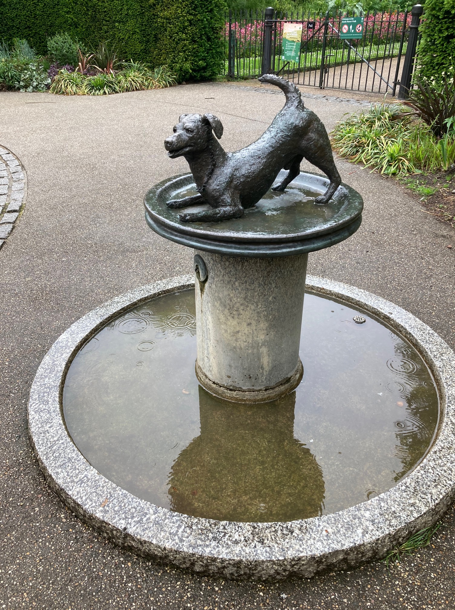 By the time I got off the bus at my next stop, at the Royal Albert Hall, the rain had eased so I went over to Hyde Park to take a closer look at the Albert Memorial. It was shining very brightly! I also walked round to Kensington Gardens where I went to see the Esme Percy Fountain. This is a memorial to London-born actor and producer Esme Percy (1887-1957), who featured in 40 films. He was born in London to French parents, studying acting under Sarah Bernhardt and at the Brussels Conservatoire before making his debut in 1904. The fountain is in memory of his love of dogs …