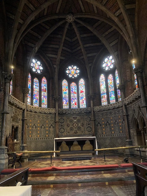 Final stop was at Belgrave Road where I walked round to St James the Less Church. A grade I listed building, it has been described as “one of the finest Gothic Revival churches anywhere”. It’s quite a contrast to Westminster Cathedral and it had been commissioned by the three daughters of the Bishop of Gloucester (James Henry Monk) to construct a church in their father’s memory in what was, at the time, an area of slums and run-down tenements in a very poor part of London – quite astonishing to think this now! The interior has a certain charm and a feeling of intimacy.