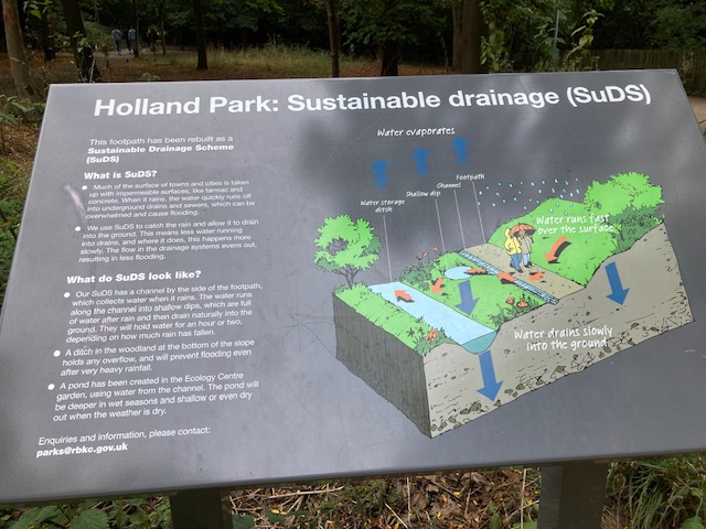 As my next place to visit wasn’t too far, I walked via Holland Park Mews, consisting of 67 houses that had originally been stables, on a cobbled road. Further along the road is Holland Park and I went to see a sculpture called Tortoises with Triangle and Time, commissioned to mark the arrival of the new millennium. Also in Holland Park is a footpath that has been rebuilt as a Sustainable Drainage Scheme (SuDS) in order to catch the rain and allows it to drain into the ground.