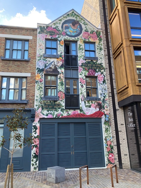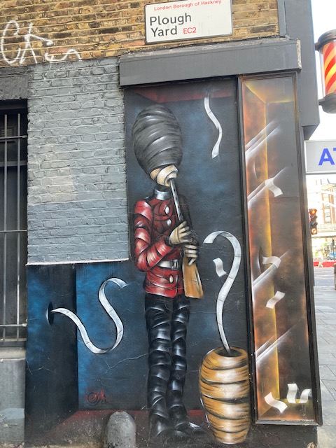 Getting near the end of the route, you’ll find Plough Yard, a small passageway that’s inhabited by artisans with some interesting graffiti at one end. Round the corner is New Inn Broadway which has an extraordinary mural depicting Romeo and Juliet on the site of the first performance of the tragic play – before the Globe Theatre was built. Known simply as The Theatre, it was built just outside the city walls, since it was outlawed to perform plays within the walls, in order to prevent the plague from spreading. Also here is a bronze seated statue of Shakespeare himself.