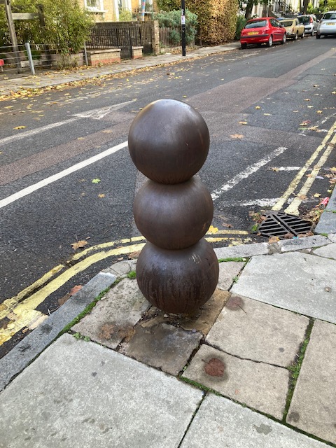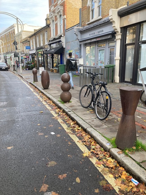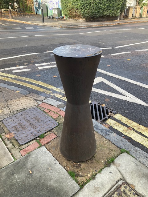 A few minutes’ walk from here is New Cross bus garage, the start of bus route 36. Hop on the bus and get out at Hanover Park and walk to Bellenden Road. Here you’ll find some unexpected street furniture made from cast iron, by Antony Gormley a local resident. Named Somewhere, he chose to model the bollards in the shapes of a snowman, peg, penis and oval. As part of the same regeneration project, are some new lighting columns with an individual bespoke design by Tom Phillips, another local resident.