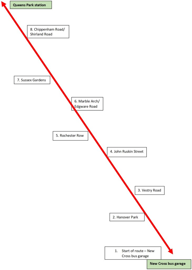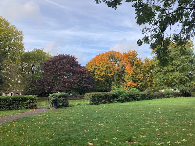 Back on the bus towards the Vestry Road stop and walk round the corner to Lucas Gardens. Occupying the former grounds of a terrace of Georgian houses, it’s a pleasing ornamental green space with winding paths, mature trees, flower beds, benches and a small playground.