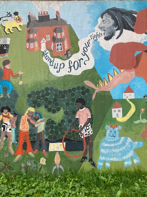 And so to South East Side Gallery at John Ruskin Street stop. The outside wall gallery is inside Kennington Park and takes up many metres of wall, depicting life in the area, then and now.