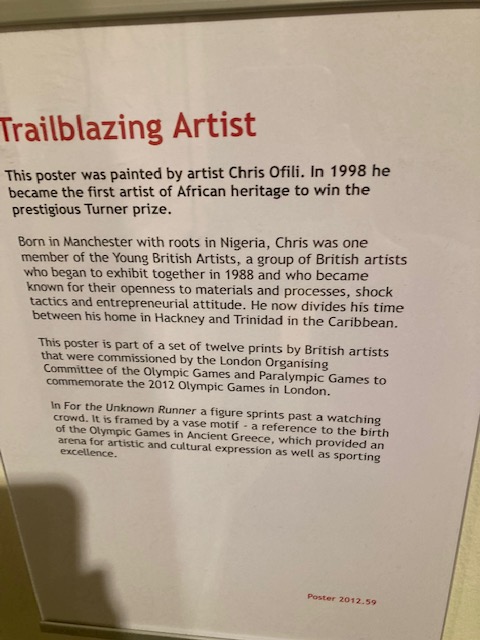 Hackney has been home to many celebrities over the years, one of whom was Daniel Defoe. Author of Robinson Crusoe, his original headstone is at the museum, although he’s actually buried at Bunhill Fields (see bus route 21). There is also an original poster by Chris Ofili at the museum, entitled For the Unknown Runner, celebrating the London Olympics in 2012.