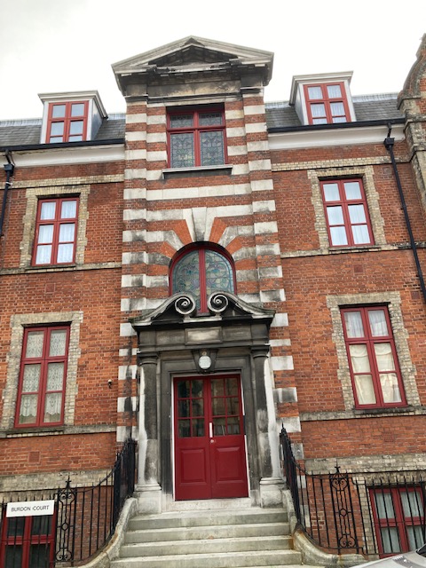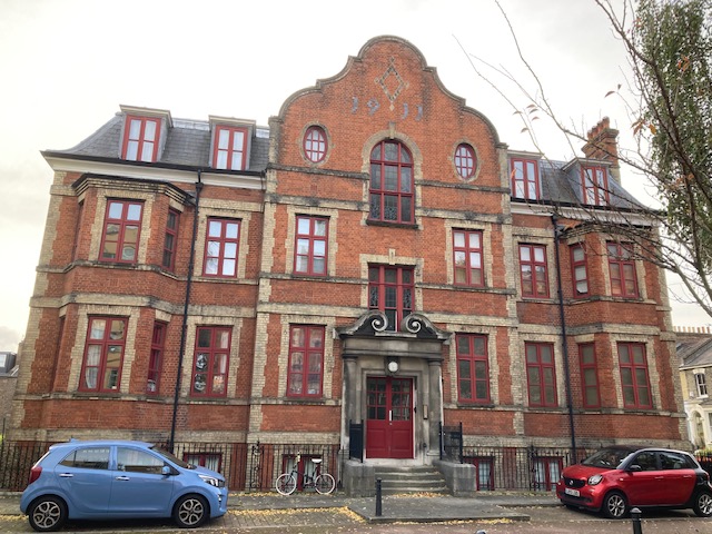 Alight here and walk round to the old German Hospital. Established in 1845, it offered free treatment to London’s then large German-speaking community which had a significant presence in the East End. The hospital’s German speaking staff remained on site during the First World War, but were interned during the Second World War with their places taken by British staff. Opposite the hospital are two grade II listed buildings, Bruno and Thomson Courts. They were originally built as extensions to the hospital and still retain some original features.