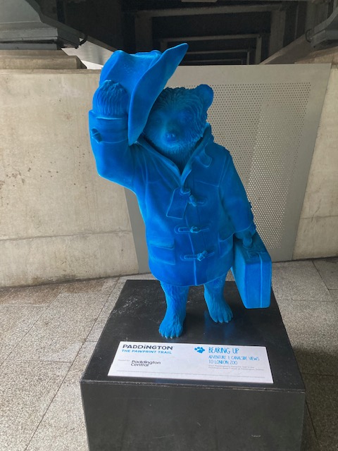 Next to the wall is a statue of Paddington bear in blue fur marking the beginning of the Paw Print Trail.