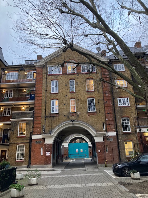 Towards the end of the 46 route is Bourne Estate. It’s an Edwardian housing estate consisting of a number of residential blocks which enclose several quiet shady courtyards containing mature trees. The design of the buildings incorporates classical features as well as arts and crafts details such as gabled walls, and casement windows on the inner courtyards and decorative mouldings to the large arches on the access ways.