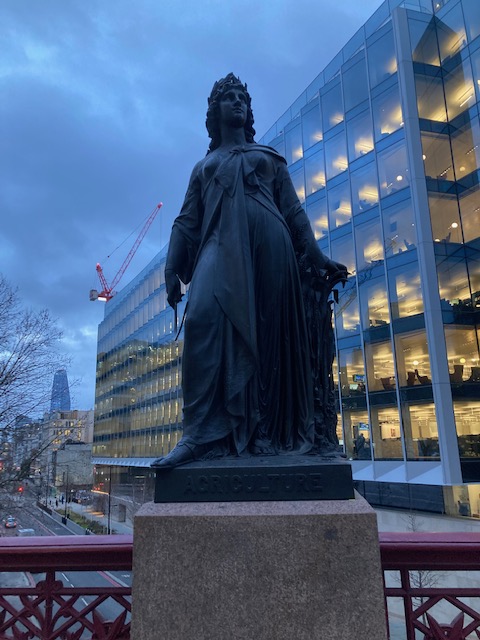 Final stop on this route is to see Holborn Viaduct. This road bridge was built between 1863 and 1869, to improve access to the city from the west end and was opened by Queen Victoria in November 1869. There are parapets adorned with figurative statues to represent commerce and agriculture on the south side and science and fine art on the north side. It’s a wonderful feat of engineering and is worth taking a look from both street level and on the bridge itself.
