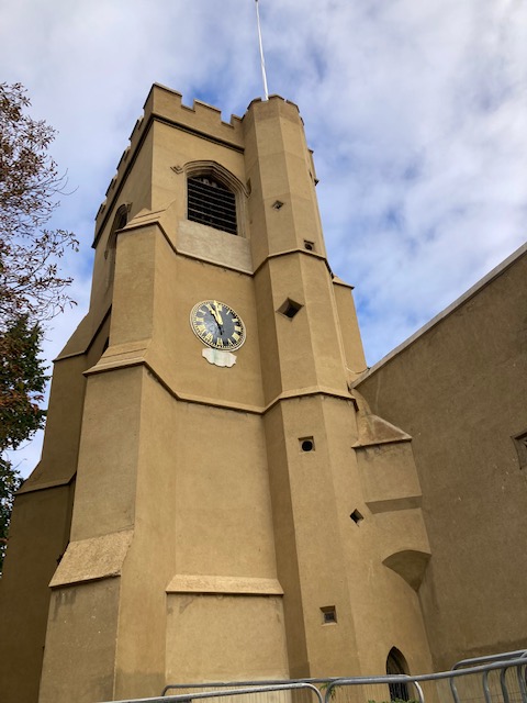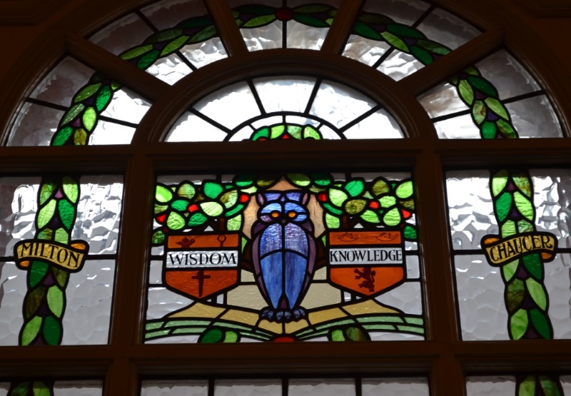 Window in Walthamstow library , the Ancient House , St Mary’s Church and Monoux almshouses