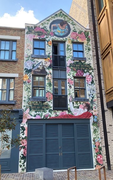 Building with a scene from Romeo & Juliet in New Inn Broadway, a bronze statue of Shakespeare nearby and street art in New Inn Yard