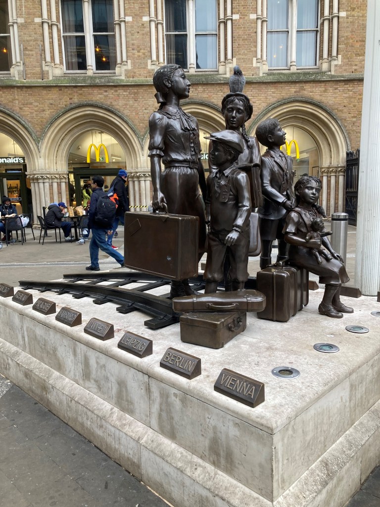 Two memorial statues of Kindertransport – outside and inside Liverpool Street station, also inside an Elizabeth line train at the station