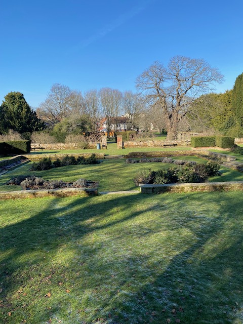 The gardens are walled and divided into individual compartments, with grassed terraces, lawns and a parterre garden. The steps to the south survive from the 1920s and a further set of steps are dedicated to the memory of Mr and Mrs Hughes, the last private owners of the Priory 1919-1941.