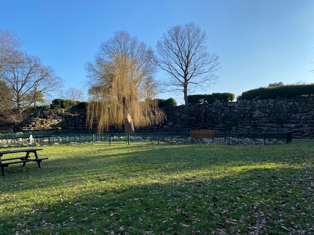 Over the road from the stop is the entrance to Priory Gardens. There is a lot to see here apart from the gardens themselves which are beautiful, even in the winter. The gates at the entrance date from the 18th century and are now hung between high C20 brick wings. The main building inside the park was originally The Priory and is now an Infants’ School.