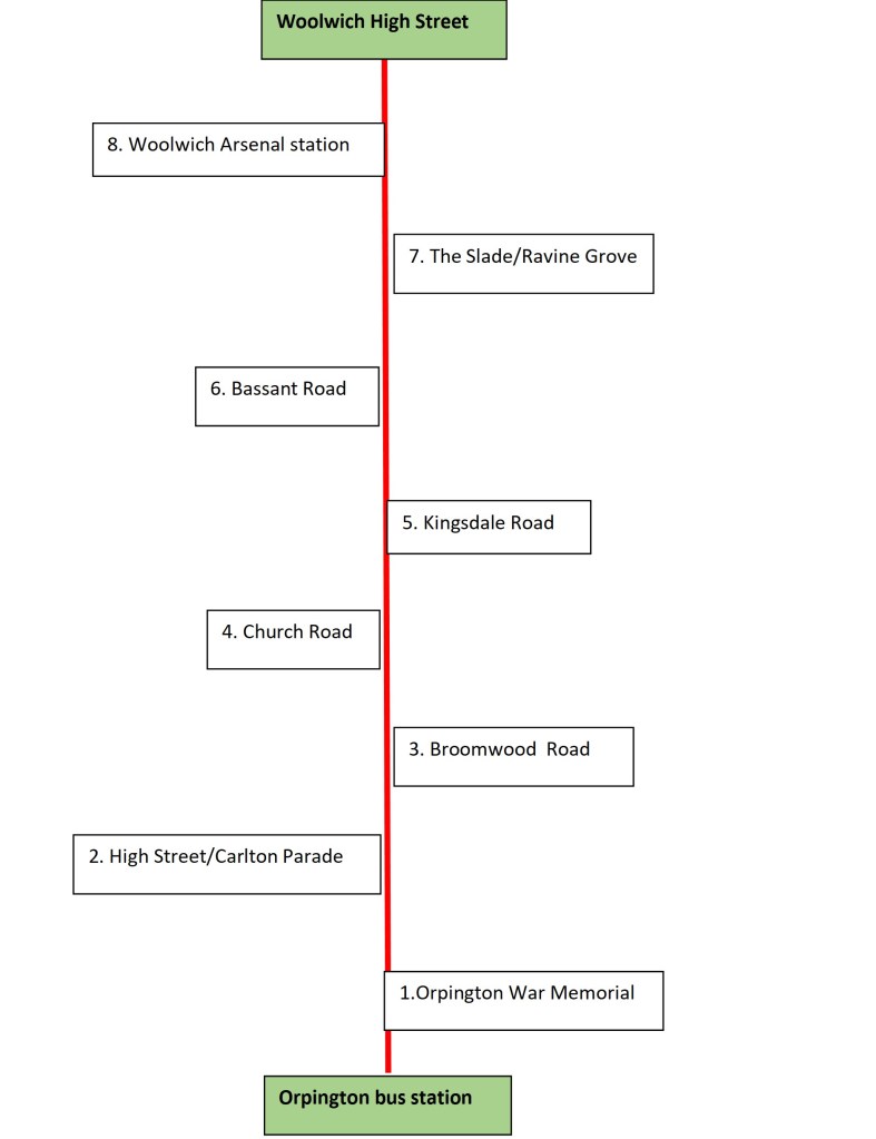 This bus route is entirely south of the river, starting in Kent and finishing near the Thames at Woolwich.