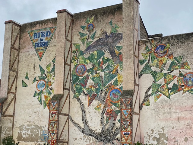 Around the corner to the chapel is Bird in the Bush Park. This pocket park has a lovely mural on a wall made up of hundreds of pieces of mosaic. The picture is of a bird in a bush, reflecting the name of the park. The bird is looking up to the sky and is grey in colour, in contrast to the surrounding leaves and flowers of the bush.