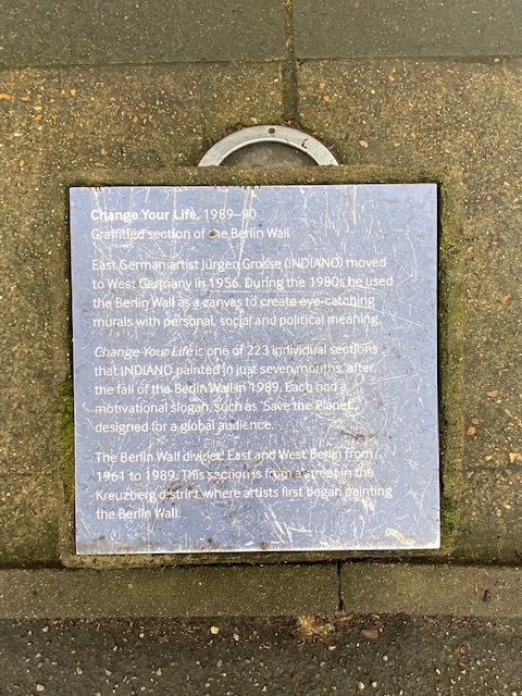 In a different area of the grounds around the museum is a peace tree sculpture by the artist Morganico. Its shape represents a meditative candle with flame. And just at the bottom of the steps of the museum is a section of the Berlin Wall. One side of the wall section is covered in graffiti, including the inscription ‘CHANGE YOUR LIFE’, by the artist Jürgen Grosse.