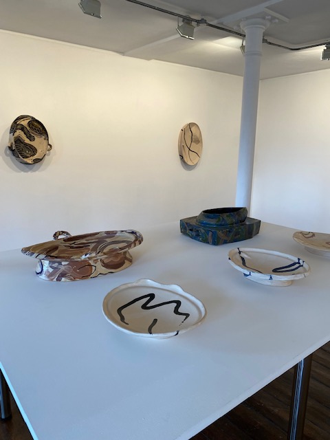 Head to another contemporary art gallery at Corvi-Mora. There are two areas for displaying art and Corvi-Mora share this space with greengrassi. Currently on display upstairs is an exhibition by Alison Britton, a ceramic artist. This exhibition is called Plattering which questions the notion of functional pottery.