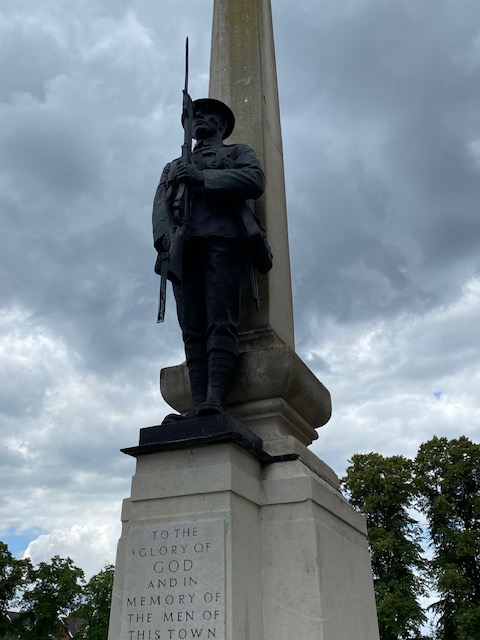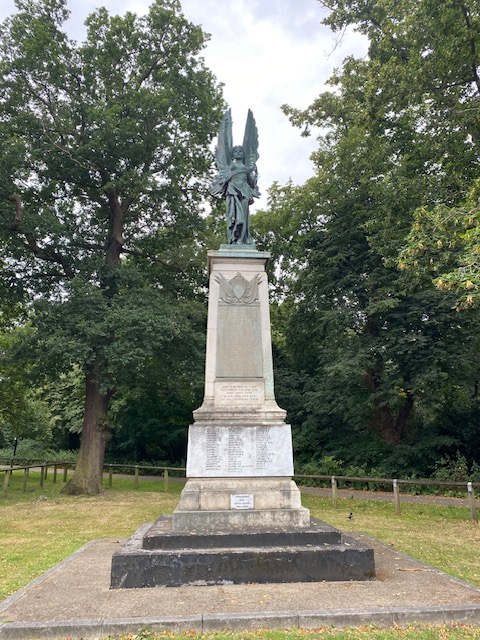 Just near the stop is a signpost for Wanstead Village, containing various symbols – Wanstead and Woodford’s coat of arms, birds and lions, trees (symbolising Epping Forest), herons and an inscription in Latin translating to “By wisdom and courage”. Opposite the bus stop is Wanstead Memorial. This has a bronze figure set on a stone base. The figure is of Winged Victory, half draped, as she carries 4 palm leaves and wears laurel wreath on her head. There is an inscribed plaque to commemorate the men and women who died in both world wars. The sculptor was Newbury Trent who also created the soldier on the Ilford War Memorial (see later in the blog).