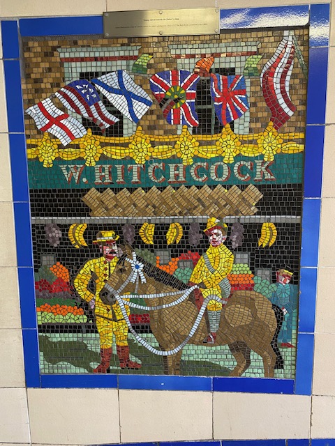 Near the bus stop is a mosaic mural of the Green Man – he of the roundabout. It’s on the corner of a terrace of houses and is named after a pub of this name that was close by.