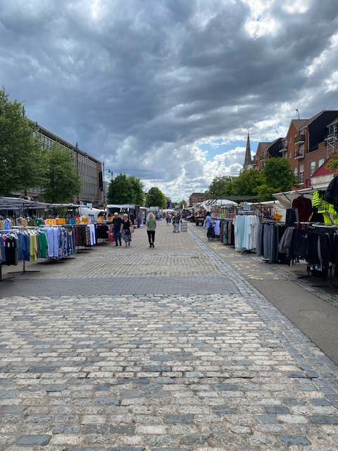 The penultimate stop is to see both Romford Market and Havering Town Hall. The market is a large outdoor one, with very many stalls selling an array of goods from food to clothing, bric-a-brac and plants. A charter was granted by King Henry III, to start it nearly 800 years ago in 1247. Originally established as a sheep market, it still operates three days a week. The Town Hall was purpose-built in the 1930s and was designed in the International Moderne style. There’s a tall window on the first floor flanked by flagpoles with a further flagpole on the roof. It’s not possible to go far inside the building but what you are able to see are some delightful art deco style doors.