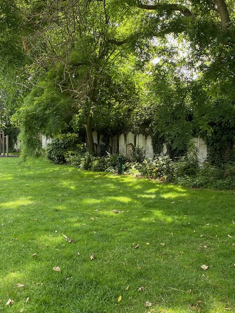 Walk to West Hackney Recreation Ground which began life as the burial ground of the original West Hackney church, consecrated in 1824. From this time until 1872, the burial ground was surrounded by market gardens, supplying fresh fruit and vegetables to the city. With the advent of the railway, there was an increased demand for housing so much of the land was given to property development. In the 1880s, plans were drawn up and approved for the land to be converted to a green space, with the park opening in October 1885. There are still many graves here but the park is very pretty and the focal point is the labyrinth which has been placed in the middle – not to be missed!
