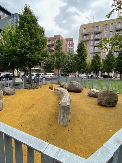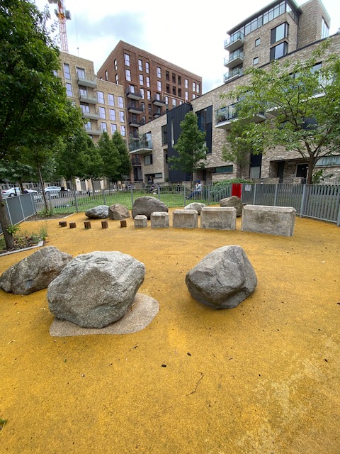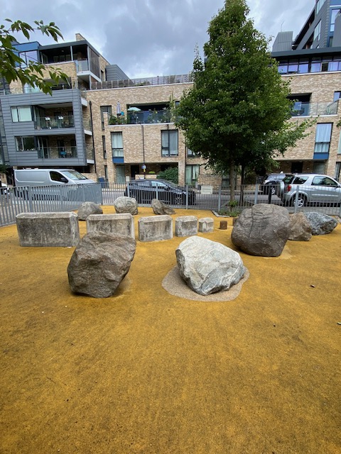 The Boundary Lane Boulder Garden is a few minutes’ walk from the stop. There’s not a lot written up about this very niche small garden but it’s an interesting find in a busy part of London (Elephant & Castle). It looks as if the boulders or stones have been placed within an enclosed space, specifically for children to climb on, but it’s also been used by adults who like to sit on the stones or the benches just outside.