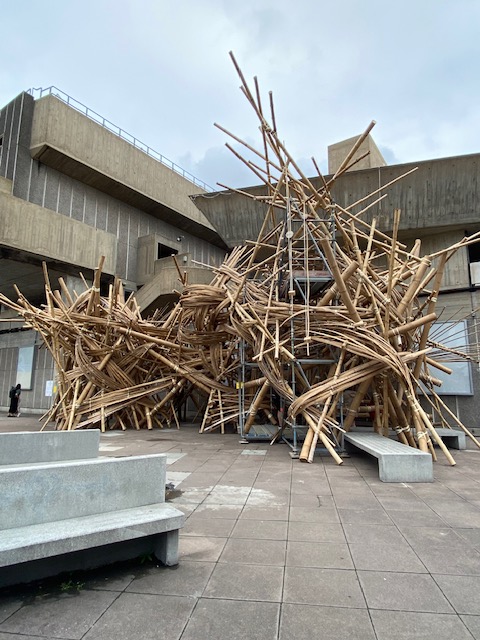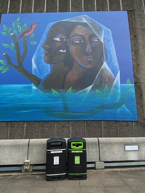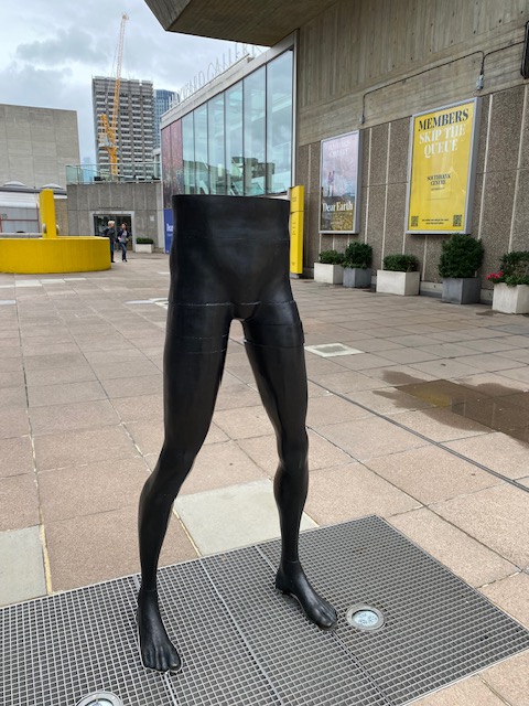 There are plenty of interesting places to visit in the South Bank Centre so you might want to be selective, if time is of the essence. Wend your way to the Hayward Gallery where there is currently an exhibition called Dear Earth, for which there is an entrance fee. In fact, outside the building are some things worth looking at. The sculptor Asim Waqif was commissioned to create Venu, a monumental bamboo construction, made from poles and bamboo, supported by an industrial metal skeleton. The work combines two common materials associated with buildings from South Asia & Europe. Nearby is Klaus Weber’s Drinking Fountains which should feature two water-spouting bronze figures but at present only has Peacock, a hybrid human whose hips from time to time emit a jet of water. The final exhibit outside is a large painting by Souad Abdelrassoul, entitled Me You and the Journey 2022. The two figures here are partially shrouded by a translucent cloth, which blends with the water, sky and skin, and which represents the very fine linen worn by Ancient Egyptian women.