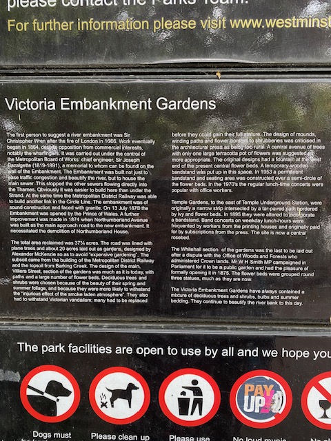 Opposite the Needle and on your way back to the bus stop at Lancaster Place, take a quick look in Victoria Embankment Gardens. These have always contained a mixture of deciduous trees and shrubs, bulbs and summer bedding, and continue to enhance the beauty of the river bank.