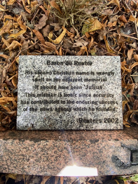 The first place to visit is West Norwood Cemetery – this is another of the “Magnificent Seven” along with Stoke Newington on bus 67. This one, however, was in a considerably better condition than Stoke Newington or Highgate – it’s very well maintained and the staff are incredibly helpful. One of them, Sam, in particular can guide you to the grave that you’re interested in or at least point you in the right direction. A few famous people are buried here – Paul Julius Baron de Reuter, who was the founder of Reuters News Agency. The irony of his tomb stone is that his name has been spelt incorrectly – it has Juluis instead of Julius. The plaque at the foot of the stone states “it is ironic since accuracy has contributed to the enduring success of the news agency which he founded”.