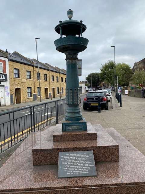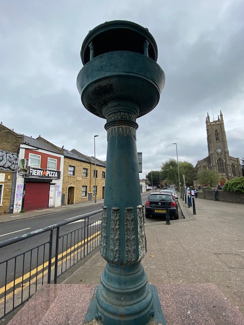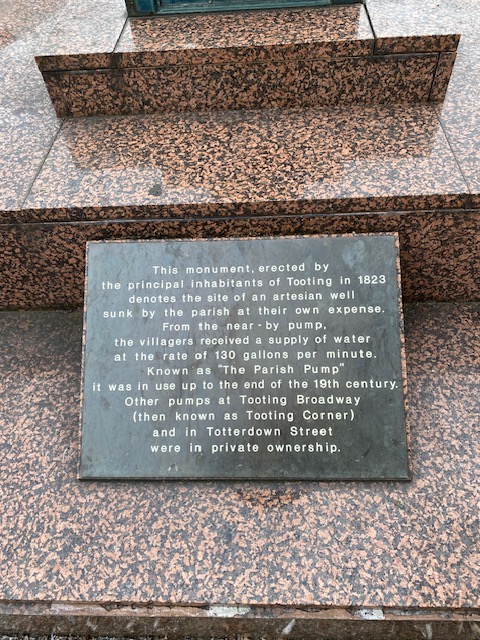 On your way back to the bus stop, you’ll see a monument on the site of an artesian well that had been sunk by the parish at their own expense. The villagers received a supply of water from the nearby pump, at a rate of 130 gallons per minute. It was known at The Parish Pump and was still in use until the end of the 19th century. The monument dates back to 1823 and was erected by the principal inhabitants of Tooting.