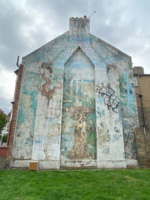 Walk round the corner from the stop and you come face to face with the Tapestry of Life mural. The house in Battersea is covered in what looks at first like peeling, abstract patterns in muted greens and blues. If you get closer, you can see the vivid details of an intricate mural emerge. The mural was painted in 1983 and depicts a scene from the Garden of Eden and features Adam and Eve in soft brown tones at its centre. The artist, Christine Thomas, was inspired by the botanical gardens at Kew. The design includes plenty of wildlife and the distinctive spiral staircases found at the botanical gardens at Kew. A little girl peeks out from one corner, near a bush of pink flowers. Sadly, the mural has aged over the decades and is now somewhat faded with large patches peeling away. Despite its state of disrepair, the mural retains its charm; if you’re in the area, it’s worth making a detour to see it while it lasts.