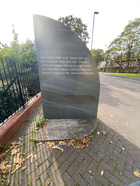 On the way back to the bus stop, there’s a poignant memorial to the people who died in the Clapham Junction train disaster in 1988. On one side the words state “For those who lost their lives in the Clapham Junction rail disaster on 12 December 1988. Those who were injured, their families, friends and all who helped and cared at the time and afterwards”. On the other side is a shape of two arms clasped across a section of railway track. The shape of the monument suggests a railway carriage cut in two.