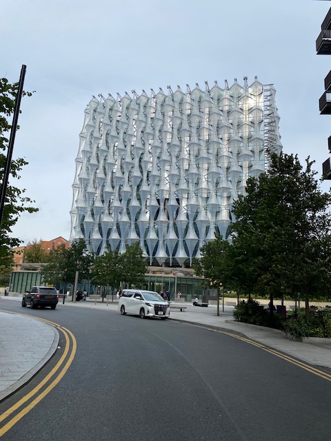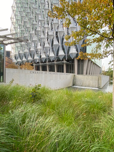 The US Embassy relocated from Grosvenor Square to Nine Elms and was formally opened in January 2018. The architect for the new building by US law had to be approved by Congress and had to be an American firm with “numerous security clearances”. The winning bid was won by KieranTimberlake. The design of the new building resembles a crystalline cube, with a semi-circular pond on one side and surrounded by extensive public green spaces and the Embassy Gardens housing development. It is also the largest American embassy in Western Europe.