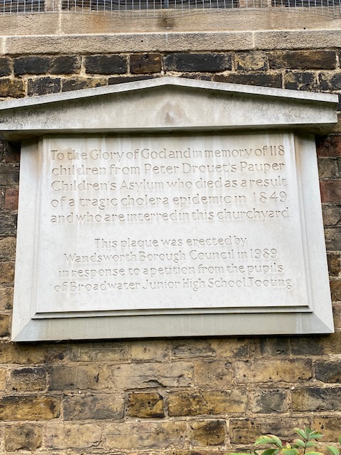 There’s a poignant wall plaque in the churchyard which is a memorial to the 118 children from a Pauper Children’s Asylum, who died from a cholera epidemic in 1849 and who are buried in the churchyard.
