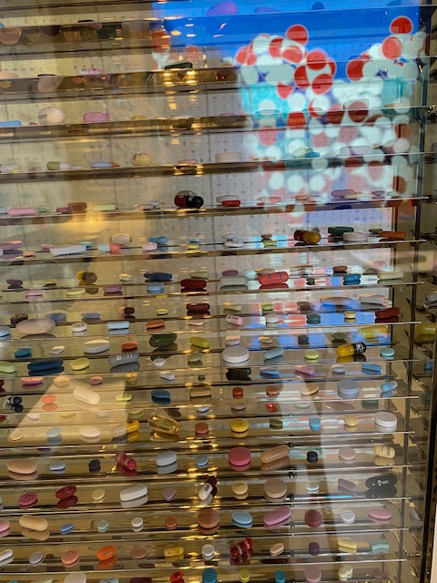 Set within the gallery is the Pharmacy 2 café, which hosts exhibitions of work from Damien Hirst’s art collection. It features custom pieces from a number of the artist’s own series, including the Medicine Cabinets and butterfly Kaleidoscope paintings.