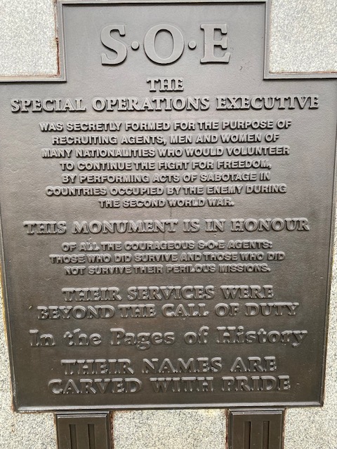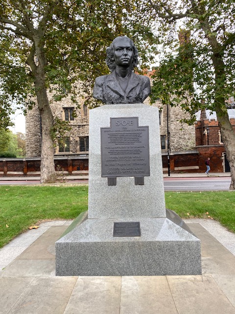 The bus stops opposite the palace which is not open to the public. Cross the road and walk along the river and you’ll come across the Monument for SOE Agents, the Special Operations Executive. This was a secret organisation of men and women who performed their covert duties behind enemy lines during World War II. Some 13,000 people worked for the SEO, of which about 3,200 were women. The bust on this particular monument is that of Violette Szabo.