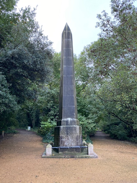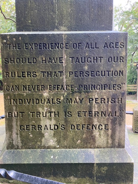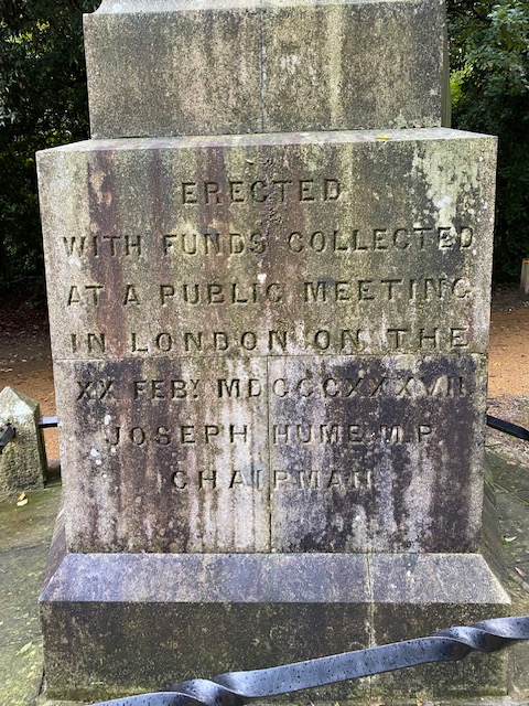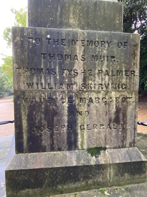 Near the chapel is a memorial for Scottish Martyrs, in the form of an obelisk. It’s a memorial dedicated to the leaders of the Friends of the People Society, popularly called the Scottish Martyrs, including Thomas Muir, Maurice Margarot, and Thomas Fyshe Palmer, who were transported to Australia in 1794. It was erected by Radical MP Joseph Hume in 1851–52.