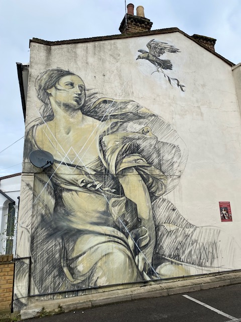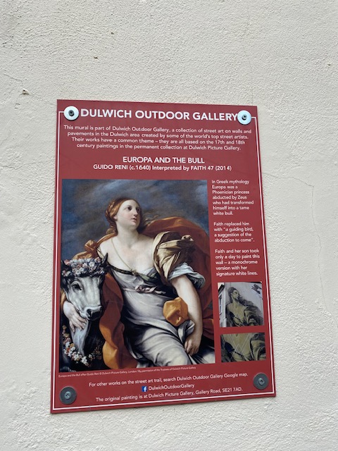 Round the corner from these almshouses is a magnificent mural entitled Europa and the Winged Bird, inspired by the original painting by Guido Reni of Europa and the Bull. The mural was created in 2014 by the artist Faith47. Murals all over south London were part of the Dulwich Outdoor Gallery, a collection of street art on walls and pavements in south-east London, created by some of the best-known street artists.