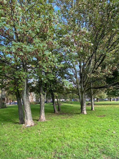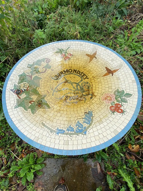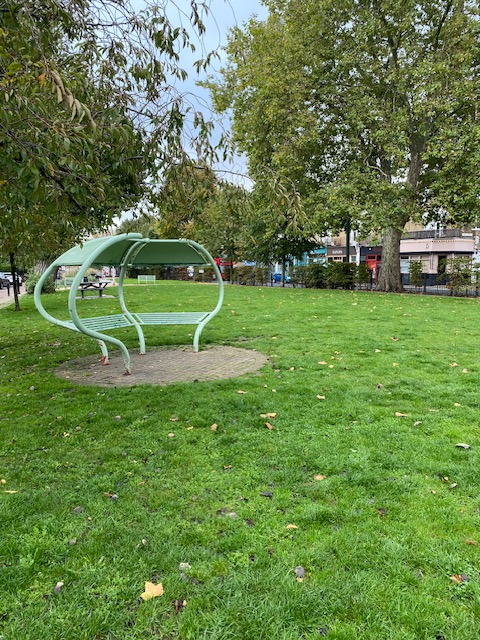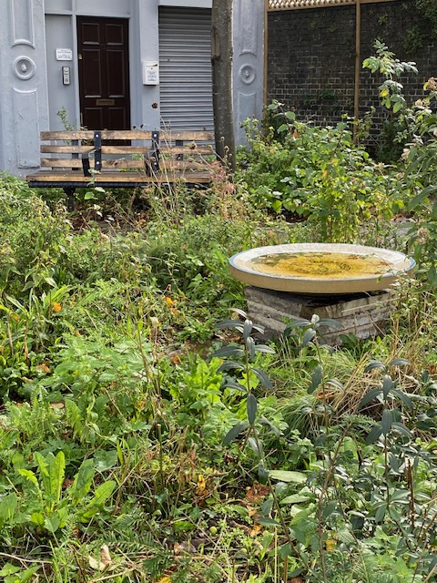 Up the road from the stop is the Octopus Garden, a pretty little street garden which is open to everyone. The garden is so-named after the building behind the garden, Octopus House. Volunteers cleared the area and installed benches and planted trees and wild flowers. In the centre of the garden is a large ceramic bird bath, with birds and plants painted around the inside and with the inscription “Bermondsey 2022” on the bottom. If you look closely at the image of the bird bath, you’ll see there is an octopus with its sprawled tentacles, also at the bottom of the bowl. Octopus Garden is a small open space with a lot of charm.