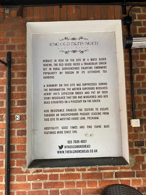 The first stop on the 78 has a number of interesting places to see. First is the Old Nun’s Head pub on the corner of Nunhead Green in Peckham. A nunnery once stood on the site of this pub which was suppressed during the Reformation. The Mother Superior received Henry VIII’s expulsion order and she put up such resistance that she was murdered and her head exhibited on a pikestaff on the Green. Her courage enabled the Sisters to escape through an underground passage leading from this site to Meeting House Lane in Peckham. The Green is still opposite the site and it’s hard to imagine the poor nun’s head being on display here.