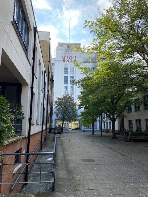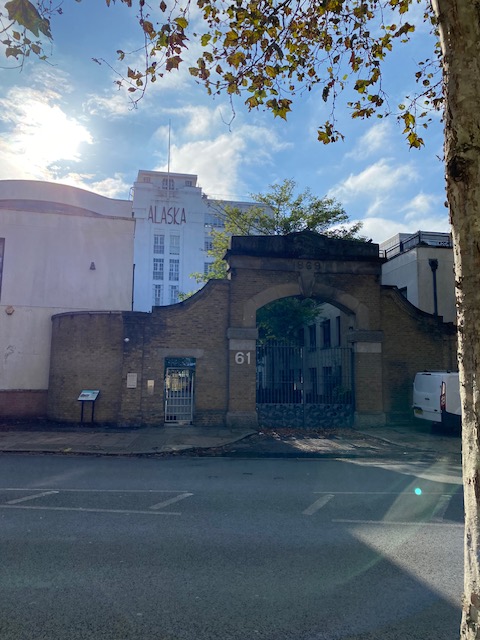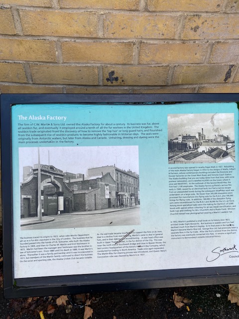 Just behind the Drawing Room is a tall, interesting-looking building with “Alaska” written at the top. The Alaska Building was converted from the former C.W. Martins & Co. fur factory, and extended in the 1920s by the industrial architect Thomas Wallis, best known for the Firestone and Hoover Buildings. The factory, which specialised in sealskin fur, at one time employed a tenth of all the fur workers in the UK. Sealskin products became highly fashionable in Victorian England.