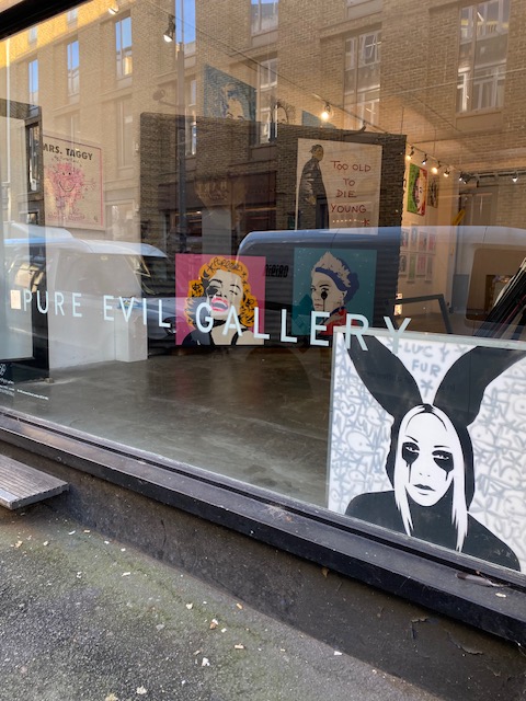 Last stop of the day is to the Pure Evil Gallery. It would be impossible to skip this, merely because its name is so intriguing. There are two galleries in Leonard Street, both full of fascinating artworks. PURE EVIL is the pseudonym of Charles Uzzell Edwards, who is an artist, gallerist and musician. His signature series of dripping celebrity portraits, known as the ‘Nightmare Series’, has taken him around the world.