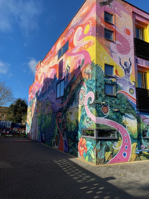 Some prominent members of the community suggested a cultural programme and once it was unanimously agreed upon, the Brent Indian Association (BIA) was established. In 1976, with a grant of £56,500, the BIA was able to purchase this building in Ealing Road. This colourful mural on the walls of the BIA was painted by Positive Arts who specialise in public/community murals, with many successful projects throughout London/UK under their belt.