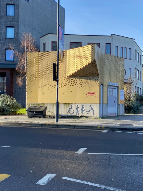 Walk up the road from the stadium and the square and you’ll find the Golden Public Toilet. Designed by architects Gort Scott, having been commissioned by Brent Council, the Public Toilet aims to “evoke the days when lavatories were civic buildings that aimed to inspire confidence and pride in a place”. It has a perforated diamond pattern on its metal façade so that during the day the perforations filter sunlight into the interior, while at night the structure appears to light up from within.
