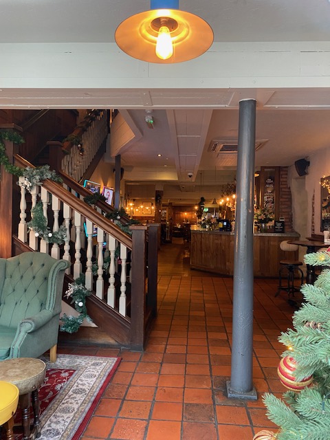 Bus 71 also goes through Kingston and I commented then on the “Out of Order” installation in Old London Road. The installation is still there as is a bronze sculpture of Flick the Chimp by Gillie and Marc. Part of a larger art display, Flick represents a Wild Chimp Foraging. Many of the other sculptures are scattered around Kingston and will move to Nine Elms in early 2024. As this journey today was in December, there were a lot of Christmas displays and it was interesting to see that the phone boxes from the “Out of Order” display were featured along with Christmas trees and lights.