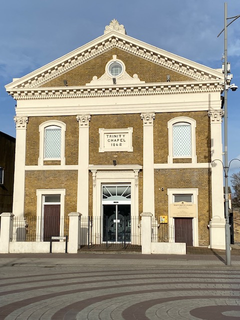 Up the road from the stop is Trinity Baptist Chapel, a really splendid-looking building in Grecian architectural style. The opening service was held in October 1868. The Baptists had begun meeting in Bexleyheath as early as 1823 and their first church was on the Broadway. Needing more space, the Trinity Baptist Chapel was built in 1868 at a cost of about £2000.
