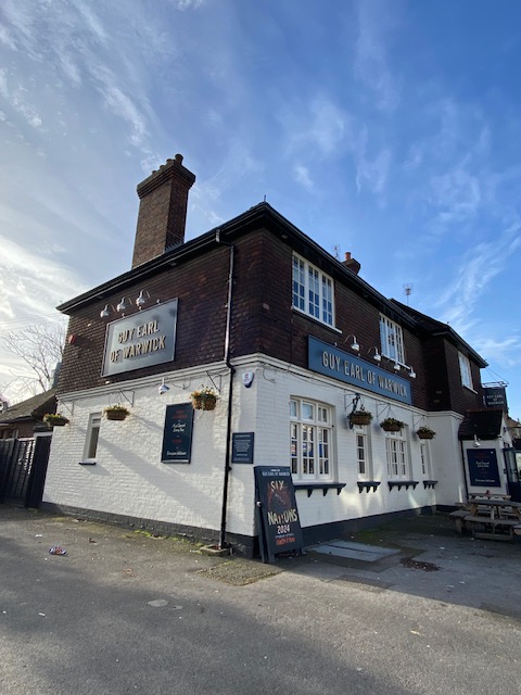 Nearby is the Guy, Earl of Warwick pub, after which the bus stop is named. Guy’s origins are more legend than history. According to legend, he was a 10th-century English hero who travelled the world on a series of daring adventures in order to impress the Earl of Warwick’s daughter – Lady Felice – and win her hand in marriage. The present “Guy Earl of Warwick” was built in 1926. The old pub, which was demolished, stood west of the present building. Licences for it can be traced back to 1730. The pub was enlarged in 1792.