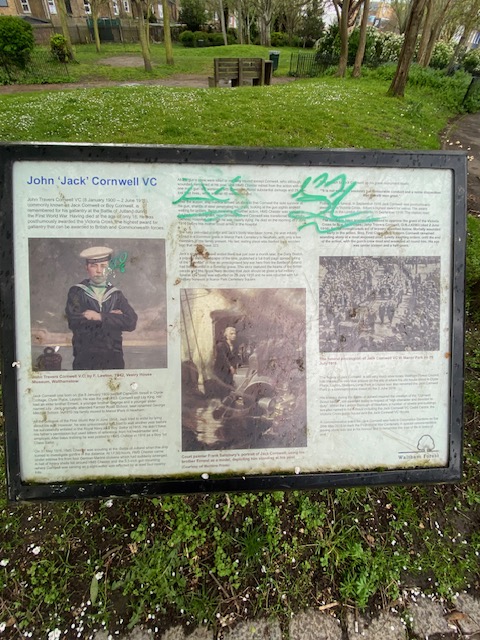 From the stop, walk round to the Jack Cornwell Park. Originally called Skelton’s Lane Park, it was renamed Jack Cornwell Park during a ceremony in 2016 as part of commemorations to mark 100 years since the youngster’s death. John (Jack) Cornwell received the Victoria Cross as a result of his bravery during the Battle of Jutland in WW1. He was only 16 when he died and was posthumously awarded the VC.