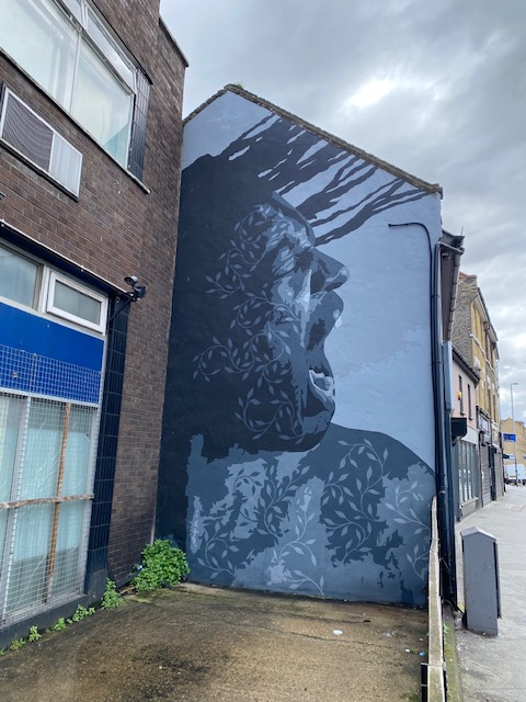 There are several murals scattered around this part of Leyton, near the High Road, and the one here is quite dramatic, a screaming, angry-looking person, placed as it is on the side of a building.